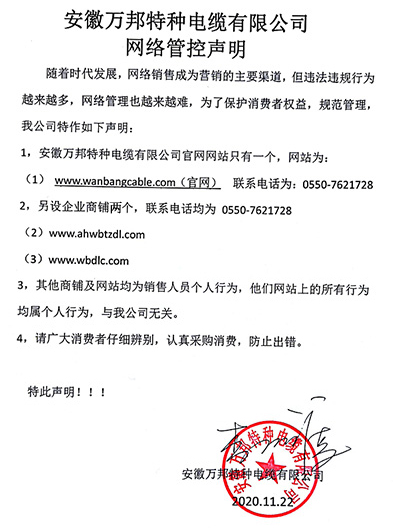 鄭重聲明:安徽萬邦特種電纜有限公司官方網站為:www_wanbangcable_com.yz-yongxin.com,除此之外無任何子網站或合作網站,其余均為假冒偽劣。電話:0550-7621728 13485756353 地 址:安徽省天長市滁州高新技術產業開發區經四路29號